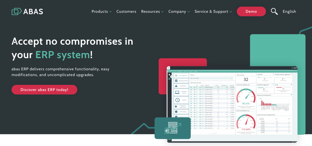 There are two very prominent and differentiated calls to action: the red “Demo” and “Discover abas ERP today” buttons, giving the user different options for how to engage.