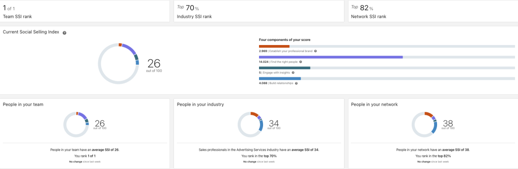 Lets start at the beginning. LinkedIn’s Social Selling Index (SSI) is a score between 0 and 100 that reflects how well you use LinkedIn to establish your professional brand, connect with the right people, engage with insights, and build relationships. In simple terms: the higher your score, the more the algorithm will amplify your content. It turns thought leadership into a game of influence. You can see yours here.